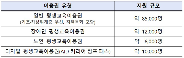 평생교육이용권은 저소득층, 장애인, 노인 등 교육의 기회를 얻기 어려운 국민에게 정부가 일정 금액을 지원해 평생학습을 누릴 수 있도록 돕는 제도입니다.