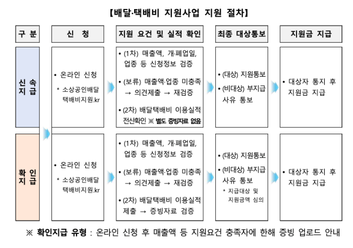 - 소상공인배달택배비지원.kr 또는 소상공인24를 통해 지원